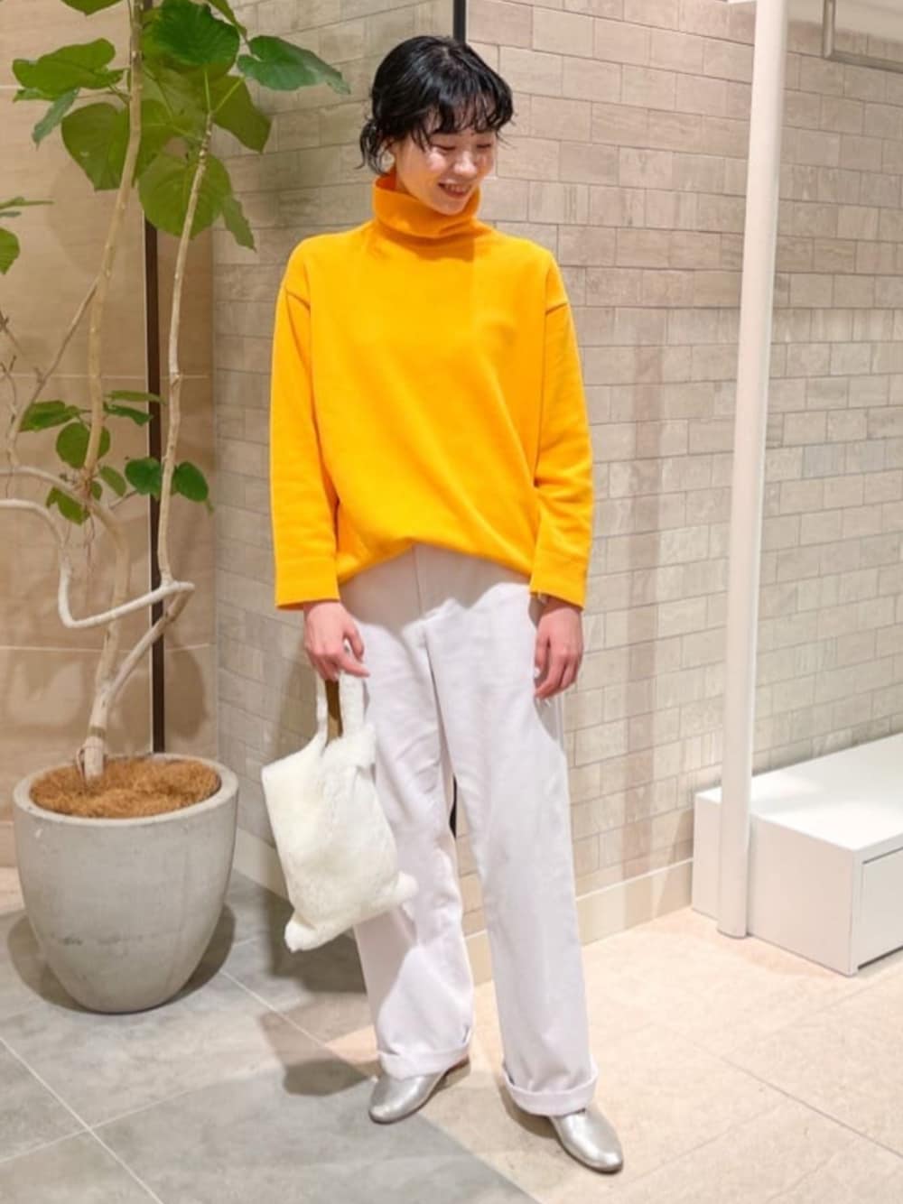鮮やかなオレンジに淡いラベンダーを合わせ、 小物はコーディネートに馴染むホワイトとシルバーでまとめました。