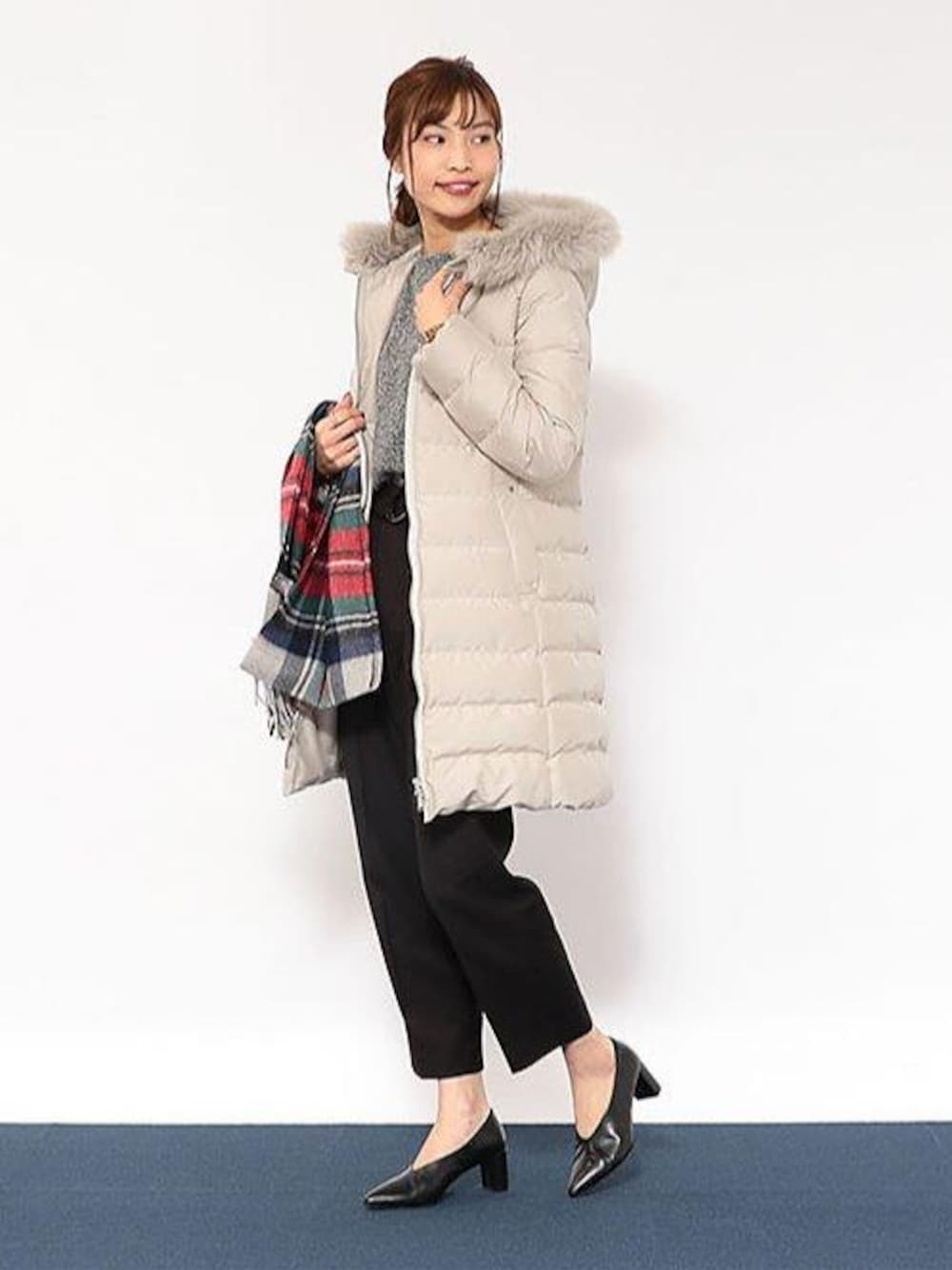 明るいカラーのアウターの中は、ダークトーンのアイテムを合わせると、メリハリが付いてすっきりまとまります。 中にラメニットを入れ、トレンドも取り入れました。