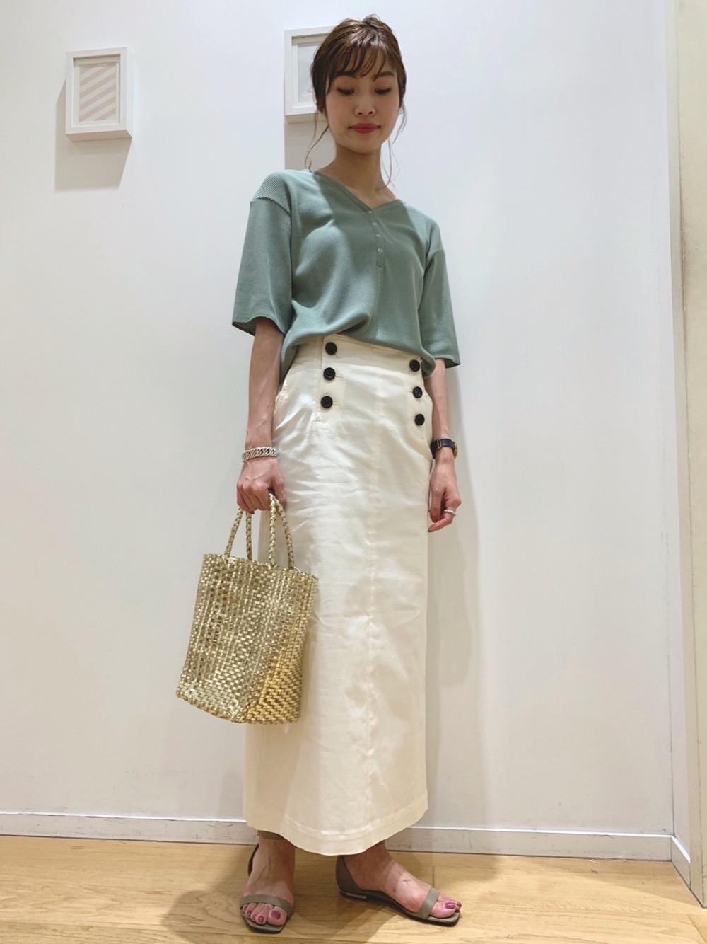 マリンスカートをメインにコーディネートしました。スッキリとしたシルエットで大人っぽい印象に。トップスはレディライクなサーマルを合わせて抜け感を出しました。前後2WAYで着て頂けます。トレンドのメタリックカラーのバッグもポイントです。