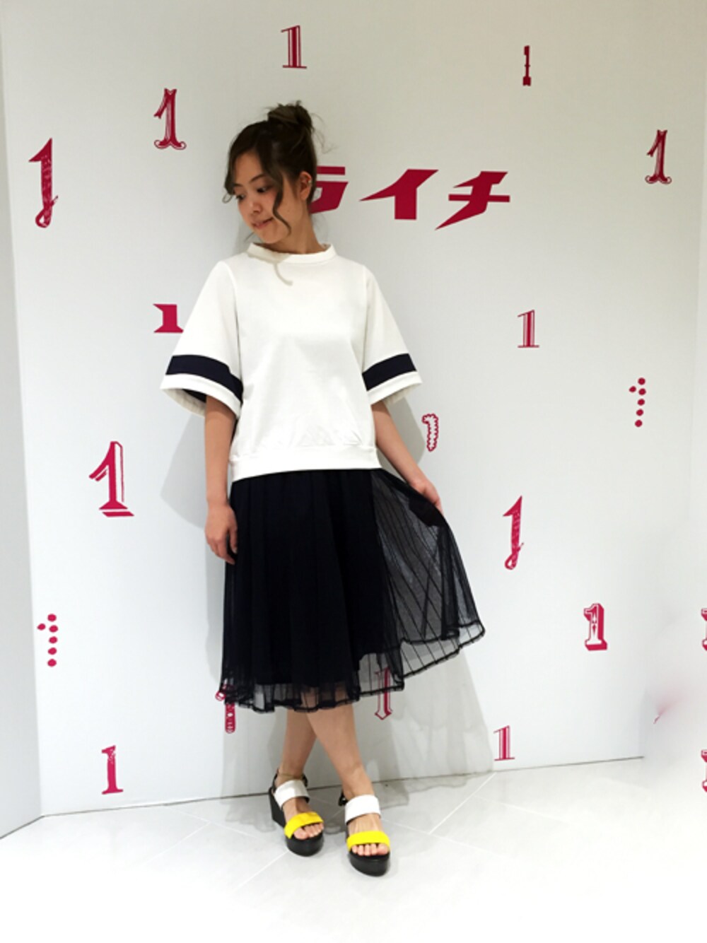 イチパーセントのビッグTシャツにストライプのチュールスカートを合わせたコーディネート。 この季節感チュールスカートは重宝しますね。