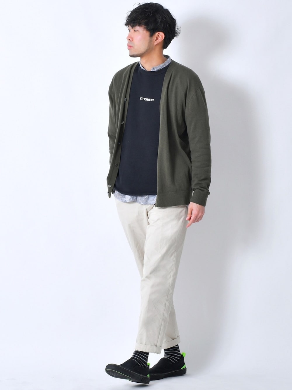 MoriCのカーディガン/ボレロ「ホールガーメントコットンVネックニットカーディガン(パターンオーダー)/カーキ[MEN]」を使ったコーディネート