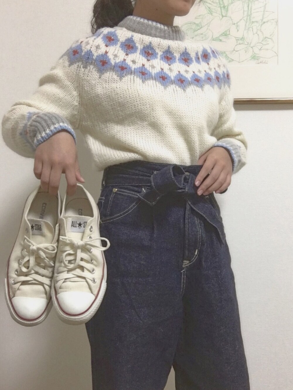 トップスは去年買ったものです. タップの方ではカーディガンですが柄が同じだったので違いますが載せてます.. とてもかわいい◎ コンバースはハイカットもかわいいけどこちらも好きです◎