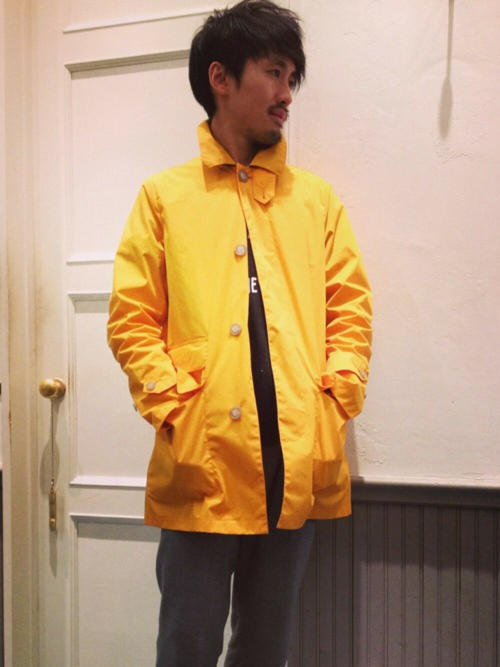 イエローのコートを引き立たせるためにコート以外はモノトーンで…