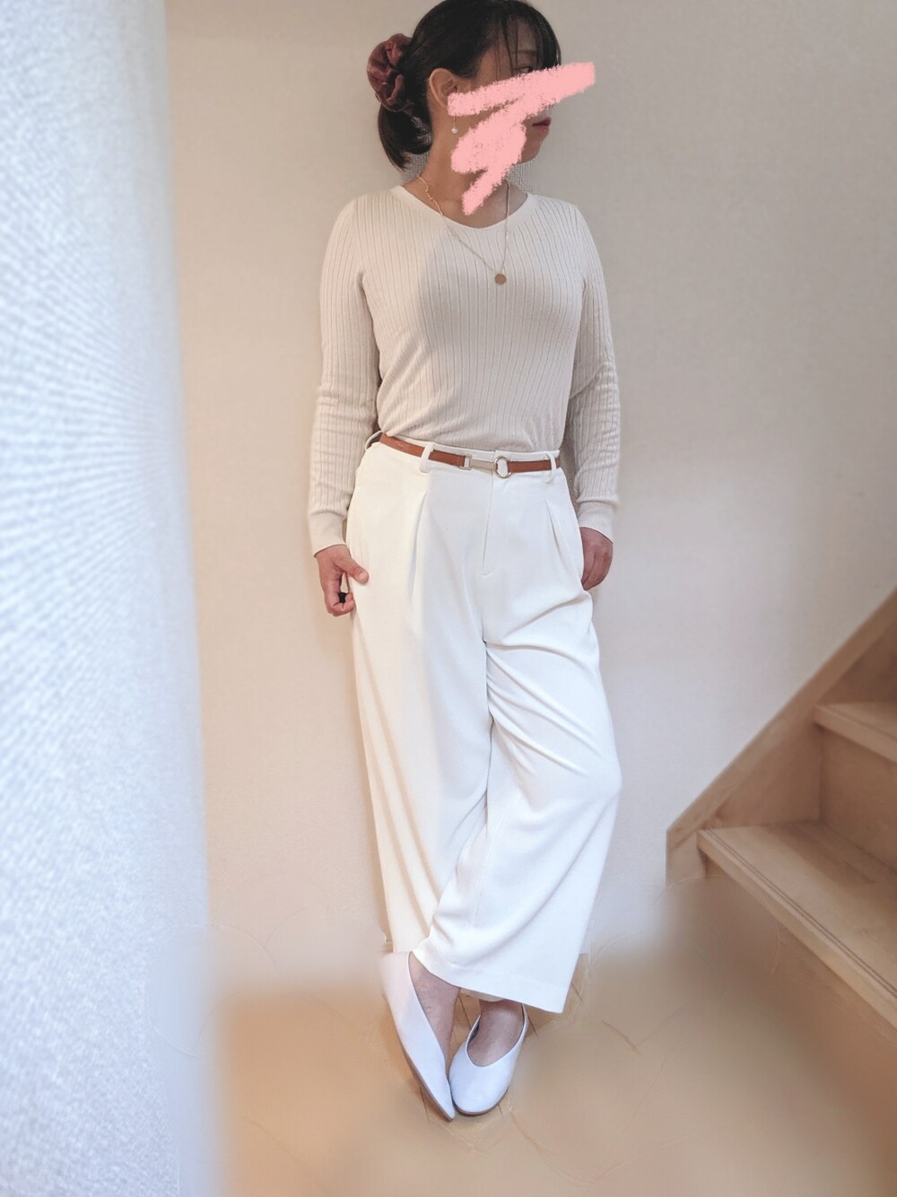 全身ホワイトコーデ。 ワントーンコーデにはブラウンのベルトを忘れないようにしましょう。 柔らかく清潔感があり、女性らしい印象になります。