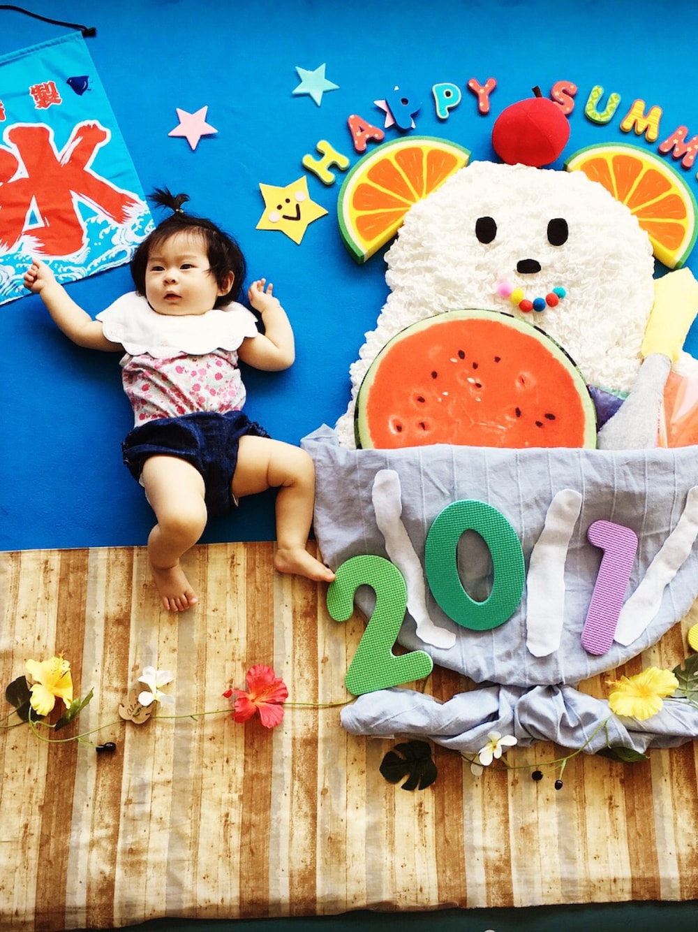 こはるお昼寝アートしてみました。 先週ハイハイレースに参加した時に一緒にできたお昼寝アート🙌 夏らしいかき氷🍧で可愛いのに終始無表情のこはるさん👶🏻笑