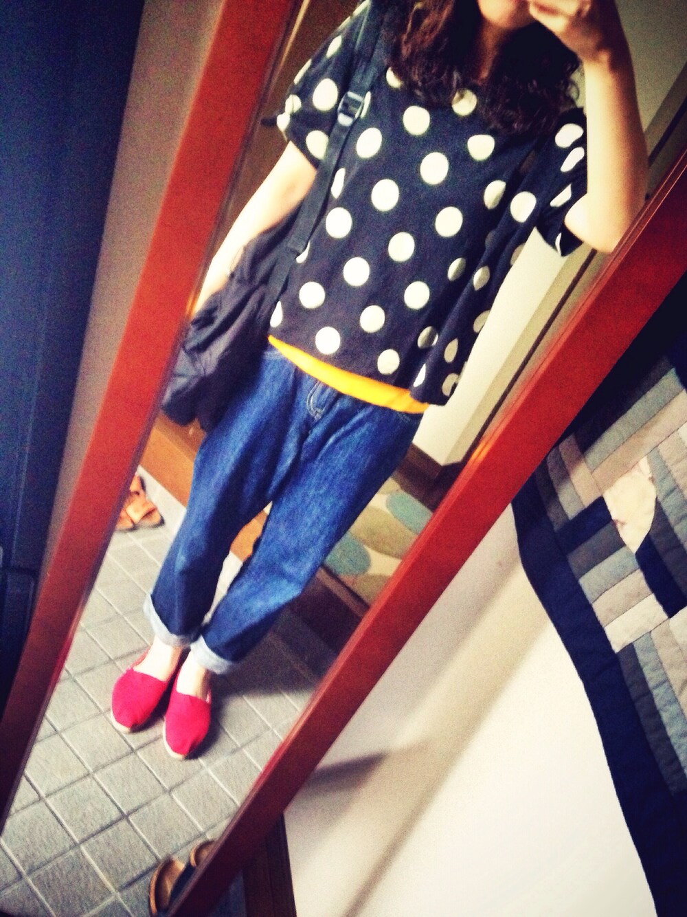もしゃもしゃのTシャツ/カットソー「綿麻天竺袖口リボンボーダー・ドットTシャツ」を使ったコーディネート