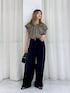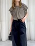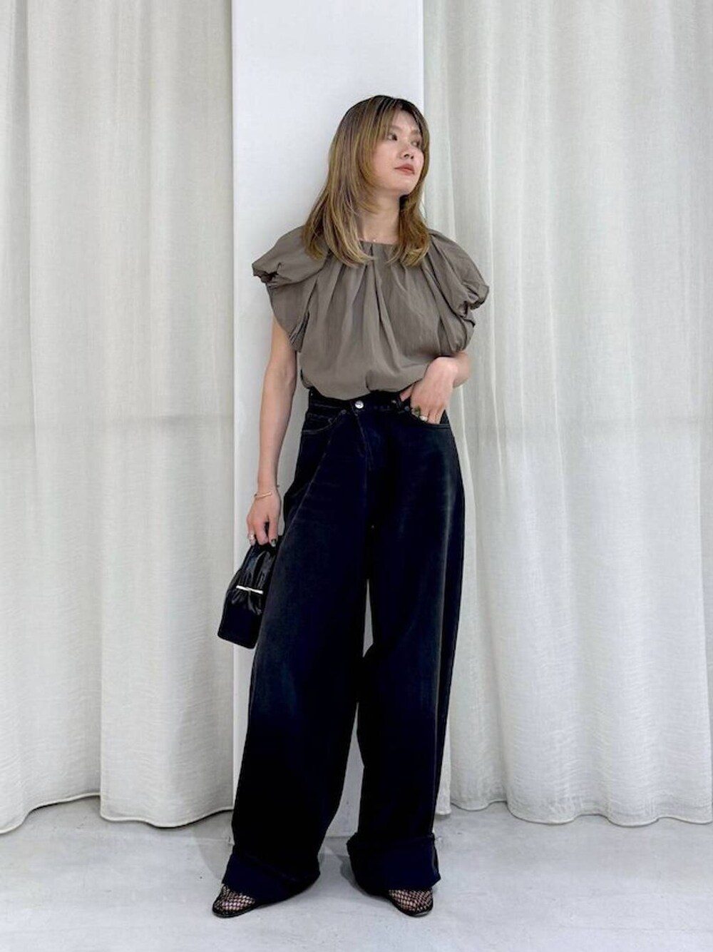 161cm ▼ナイロンバルーンスリーブブラウス サイズ感:ややゆったりサイズです!着やすさ抜群で、きつい感じもありませんでした!着丈もありますので出しスタイルも、インスタイルもしやすいです!袖も二の腕が隠れるいい長さ! 素材感:とーっても軽いシャリ感のある生地で、夏はとても涼しい素材です!汗染みもきにならずサラッと着れる一枚です! ▼ BETHデニムBLK サイズ感:ウエスト、足幅ともにゆったりです。26サイズですが、右のベルトループにボタンを引っ掛けてから止めてます。骨盤で落として履いて頂くデザインなのでゆったりしています!ルーズな印象がとてもお洒落で可愛いデニムです!私は25サイズで裾を2回程折り返し、フラットな足元で履けるくらいでした!