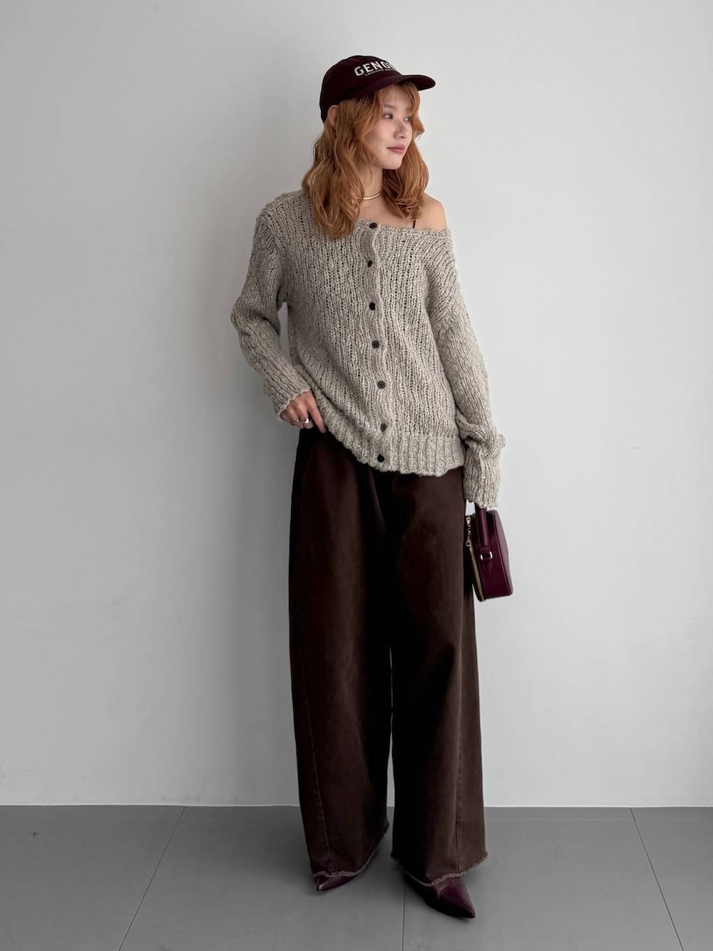 ▼ ロ-ゲ-ジ2wayPO サイズ感:ややゆったりサイズです。着丈はそこまで長い感じはないので、ボトムスも選ばずで着れる一枚です。 前後2WAYでボタンあり、無しどちらも楽しめる一枚です。 素材感:ポコポコとした表情のあるローゲージニットです。網目がざっくりすぎないので透け感も気になりずらいのと、ひっかけにくいデザインで安心感もあります。 ▼ バレルレッグデニムPT サイズ感:ややゆったりサイズです。裾がカットオフされているから、フラットシューズとも相性抜群のデザイン。 サイドの接ぎだけを使って作られているから、ダーツがないのでカジュアル過ぎずに大人のバレルレックデニムが楽しめます。 素材感: 身体のラインをあまり拾わない、ちょうどいいオンス感。硬過ぎず、柔らか過ぎずで、生地の程よいハリがカーブデザインを綺麗に出してくれます!
