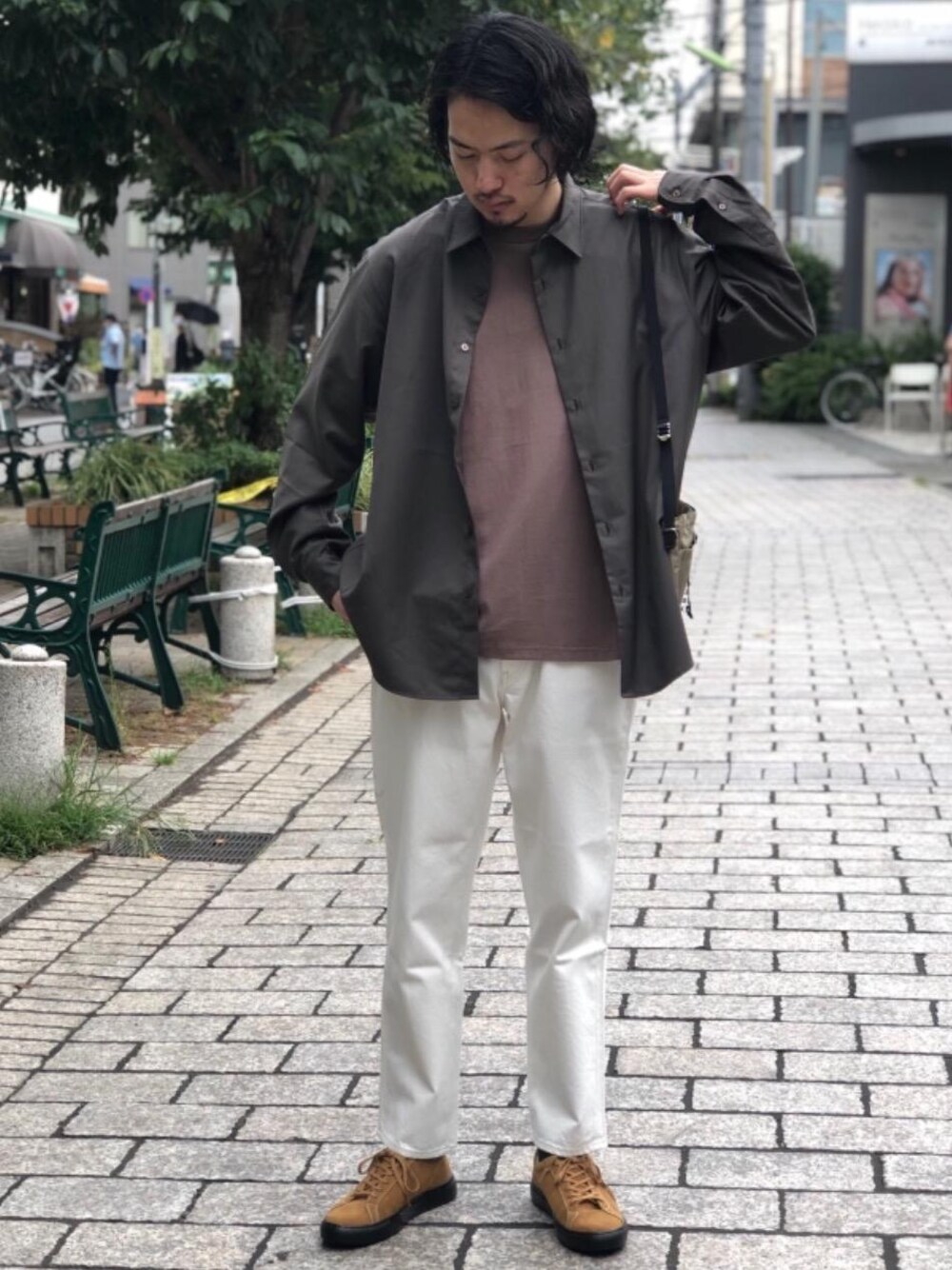 ウォッシャブルビエラ素材のルーズシルエットシャツを使ったスタイリングです。全体をベージュブラウン系の色で統一した秋らしいカラーリングを意識しています。