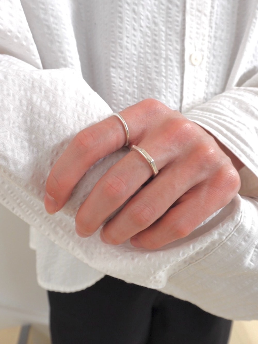 ラルリング×オクトリングのコーデ💍 質感の似ているリング同士なのでより統一感を出すことができ、キレイめな大人っぽいスタイリングを作れます✨ どちらのリングもサイズ展開が広いため、メンズの方はぜひご参考ください😊