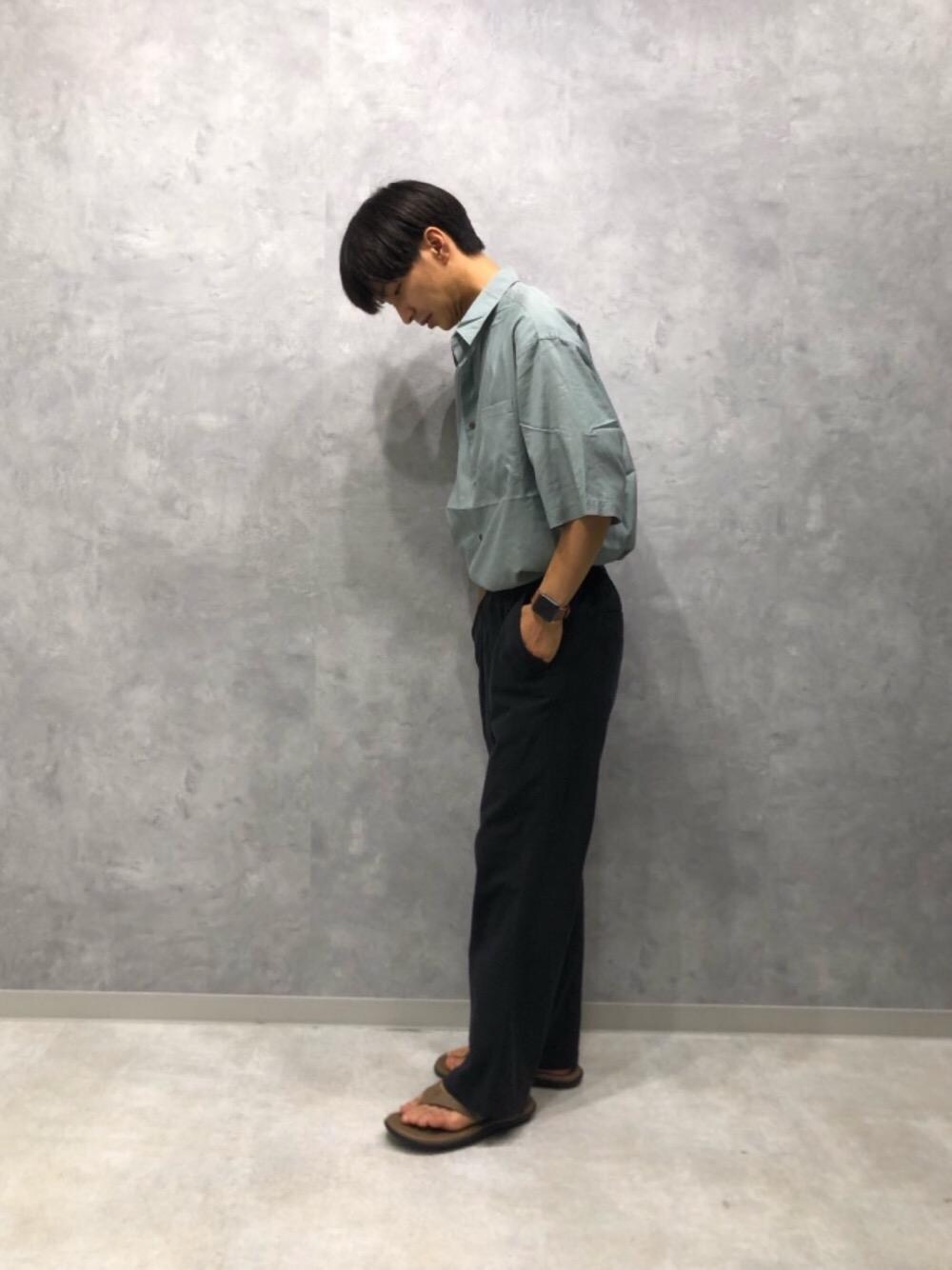 キュプラ素材のサラッとした発色の良いルーズシルエットシャツをタックインし、すっきり見せる所とゆるく見せるところでメリハリ良く見せてます。 下は黒のストレートパンツでほどよくルーズに。 足元はサンダルで抜け感を出しました。