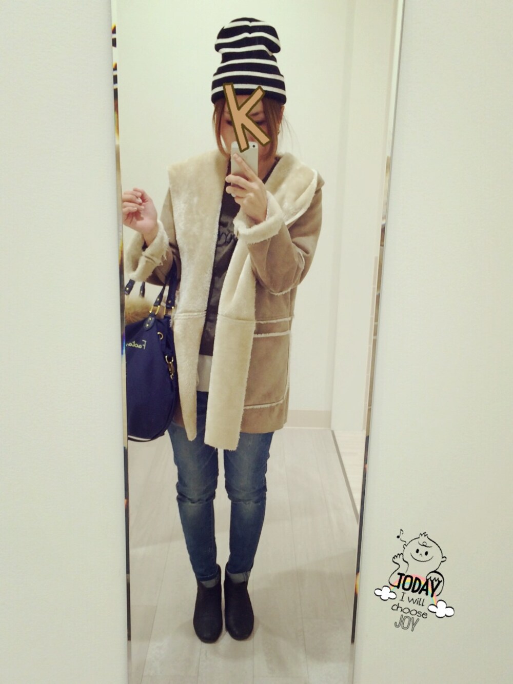 iPhoneが死にかけなのでバッテリー交換しにきてます☺︎ 寒すぎたからムートン風着たけど館内あっつ。。w でも荷物なるから我慢我慢。。 デニム若干デカイ( ;´Д`)