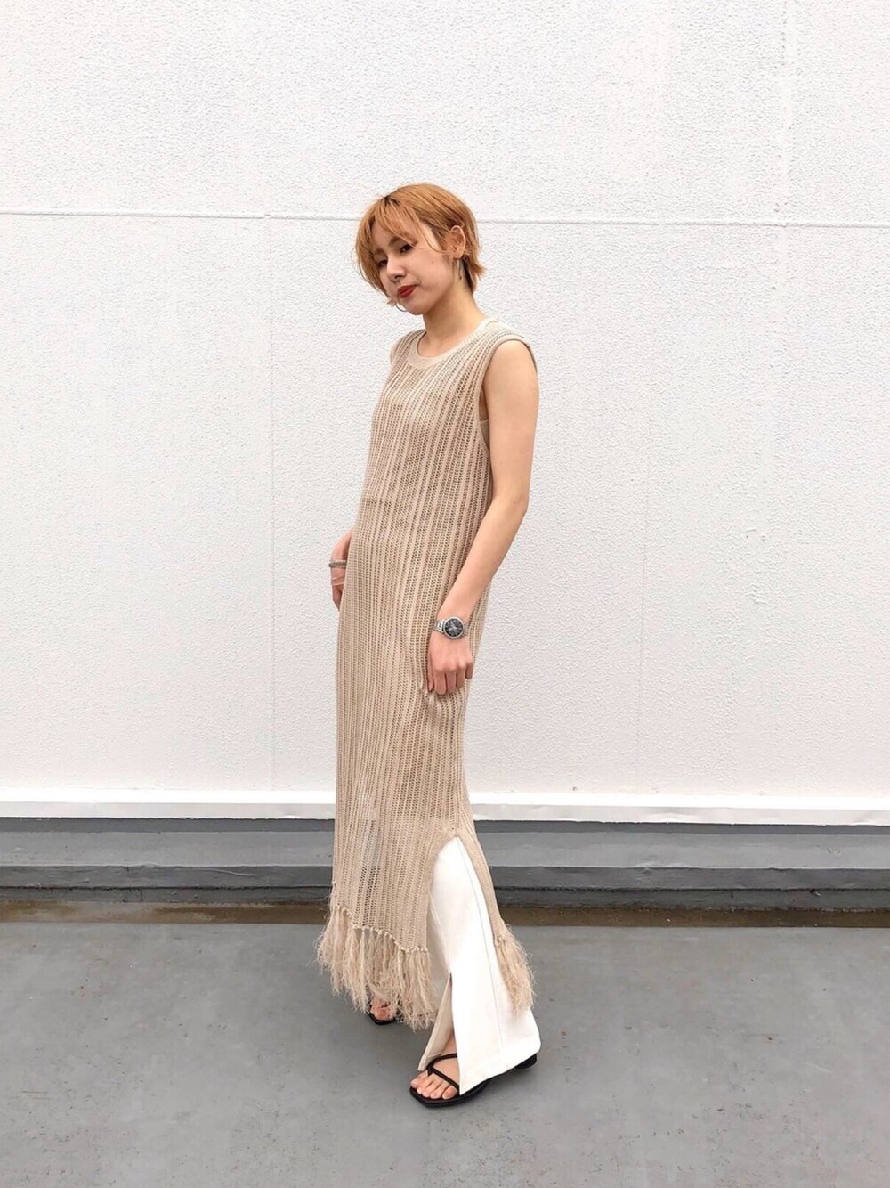 ベージュのノースリーブワンピはパンツとレイヤードするのがおススメです✴︎