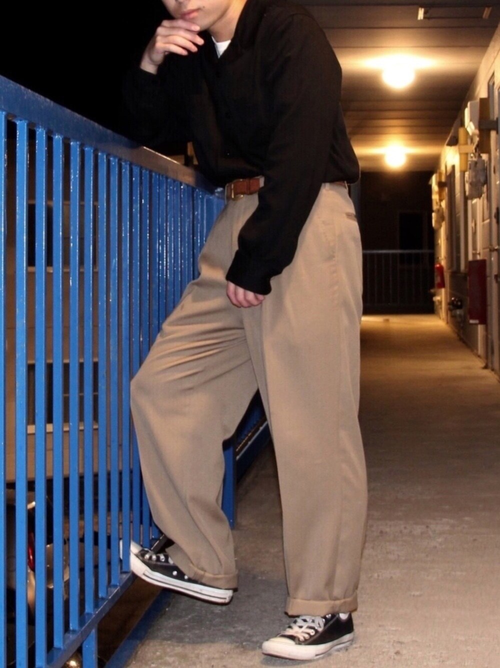 ワイドパンツに開襟シャツをイン。 どちらも古着です。 暗くてシャツが見えにくいかもです、、