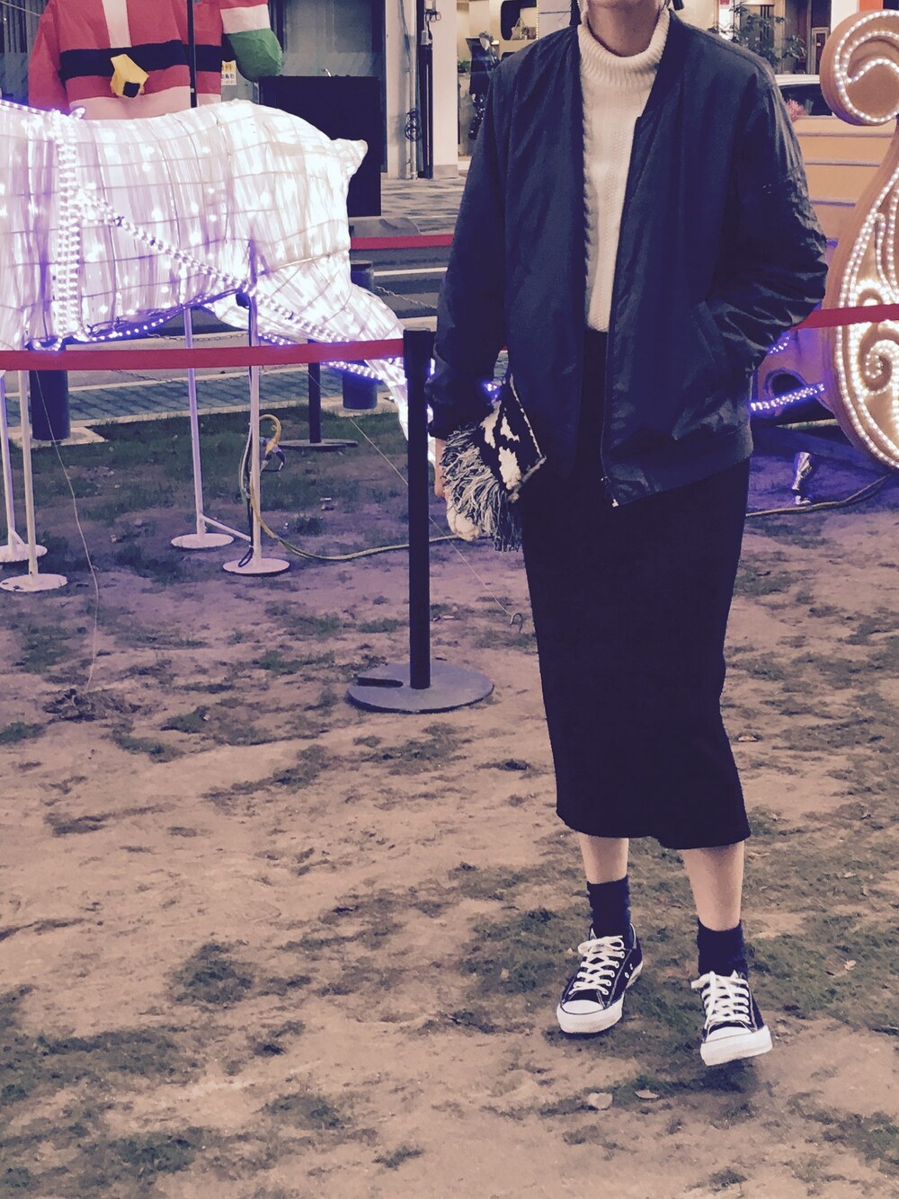 街はクリスマス仕様ですね🎄🎁 ワンピースの白ニットはスカートにイン!