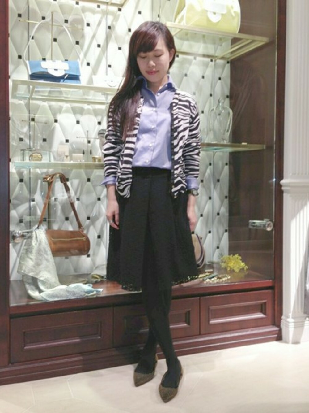 ゼブラ柄のカーディガン+シャツの新鮮なコーディネートです。 ボリュームのあるスカートにウエストインでバランスをとりました。