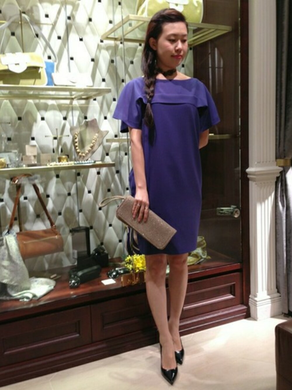 フィガロの得意なパーティスタイル。 シックなブルーのドレスで隙のない着こなしに。