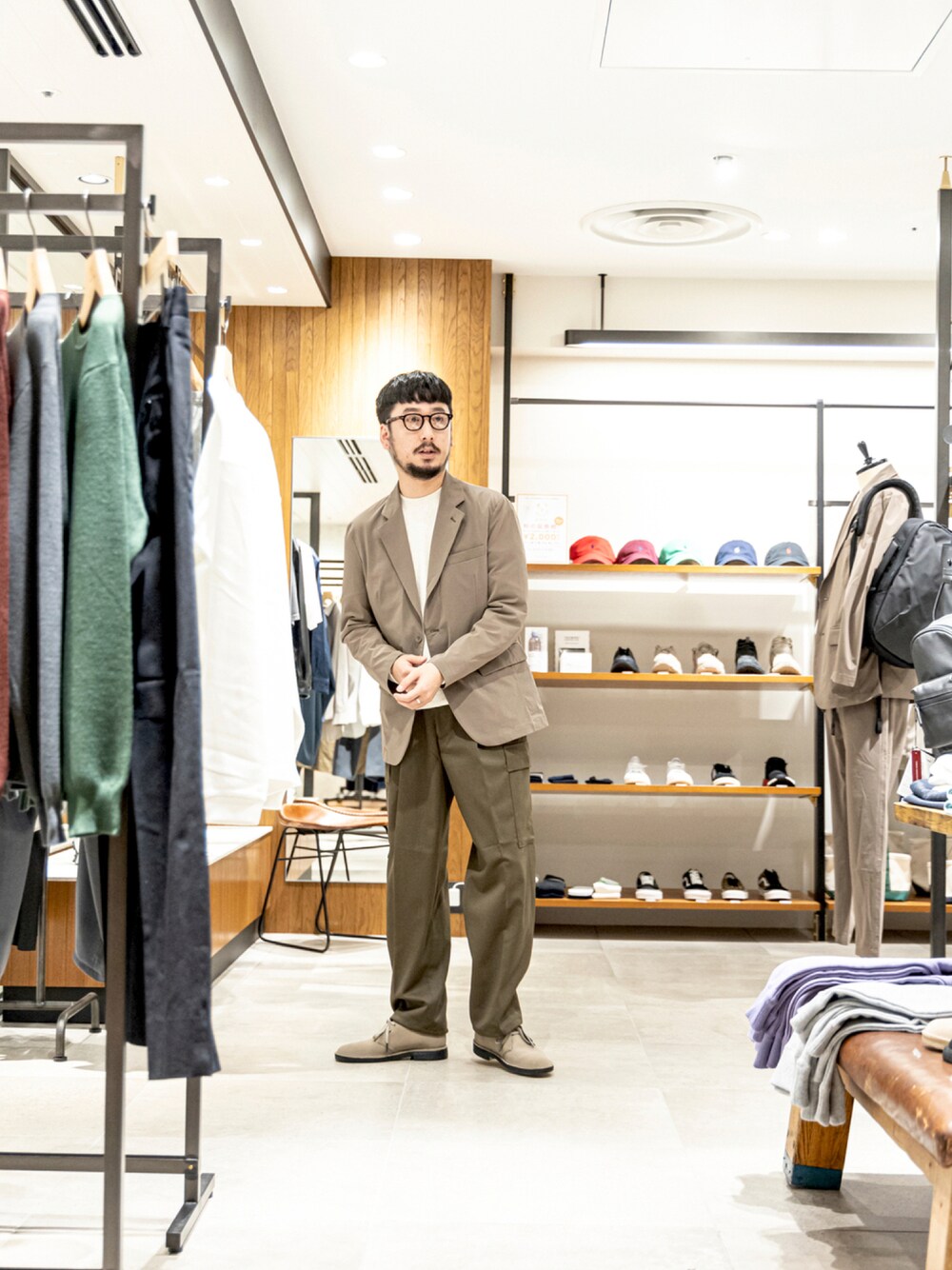 皆さま、こんにちは。森山です。 たまにはお店の中でのワンショットを。 カーゴパンツ+ジャケットスタイルは今、おすすめです。 素材は軽めで堅すぎない様に。