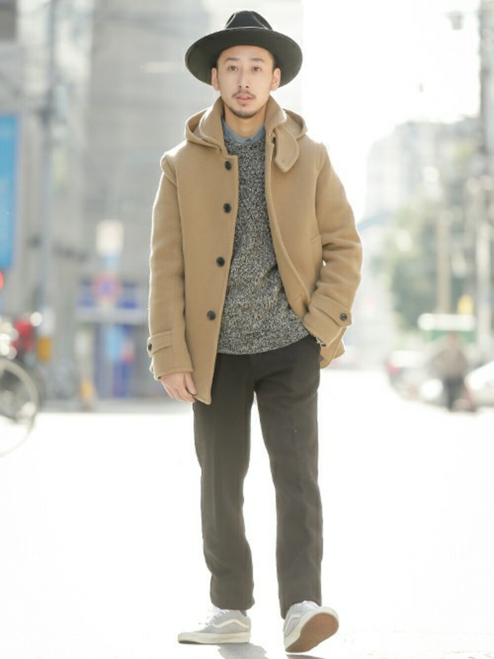 フードを付けても外しても使えるこのコートは着回し力高めです。ウールパンツ+スニーカーのヌケ感のあるスタイルで合わせるのが気分です。