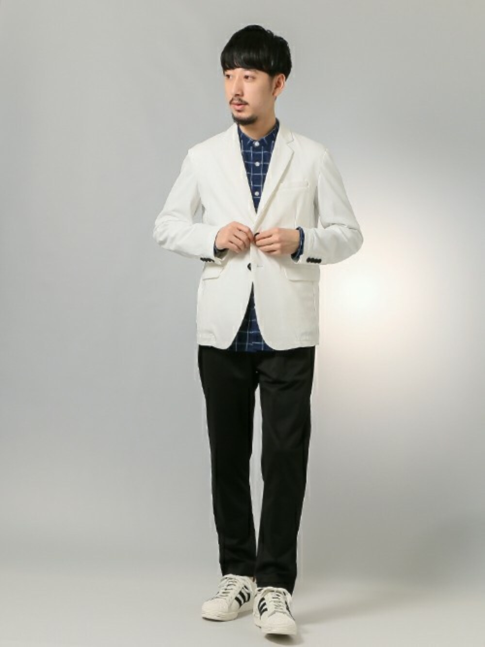 バンドカラーシャツに夏素材のデラヴェジャケットを合わせて。