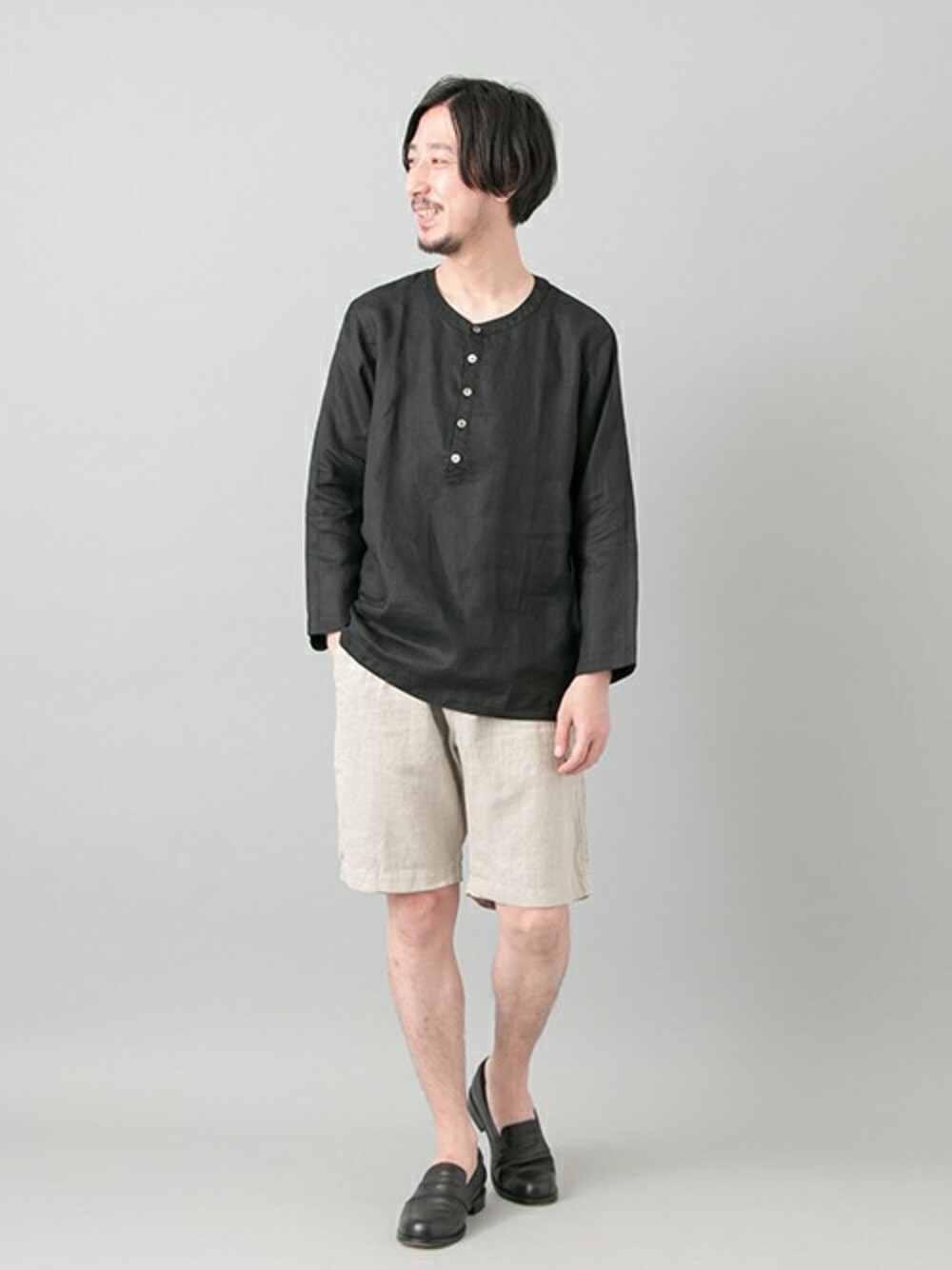 リネンアイテムのコーディネートにブラックを差し込むことで軽くなり過ぎず、適度なカチッと感を出せます。
