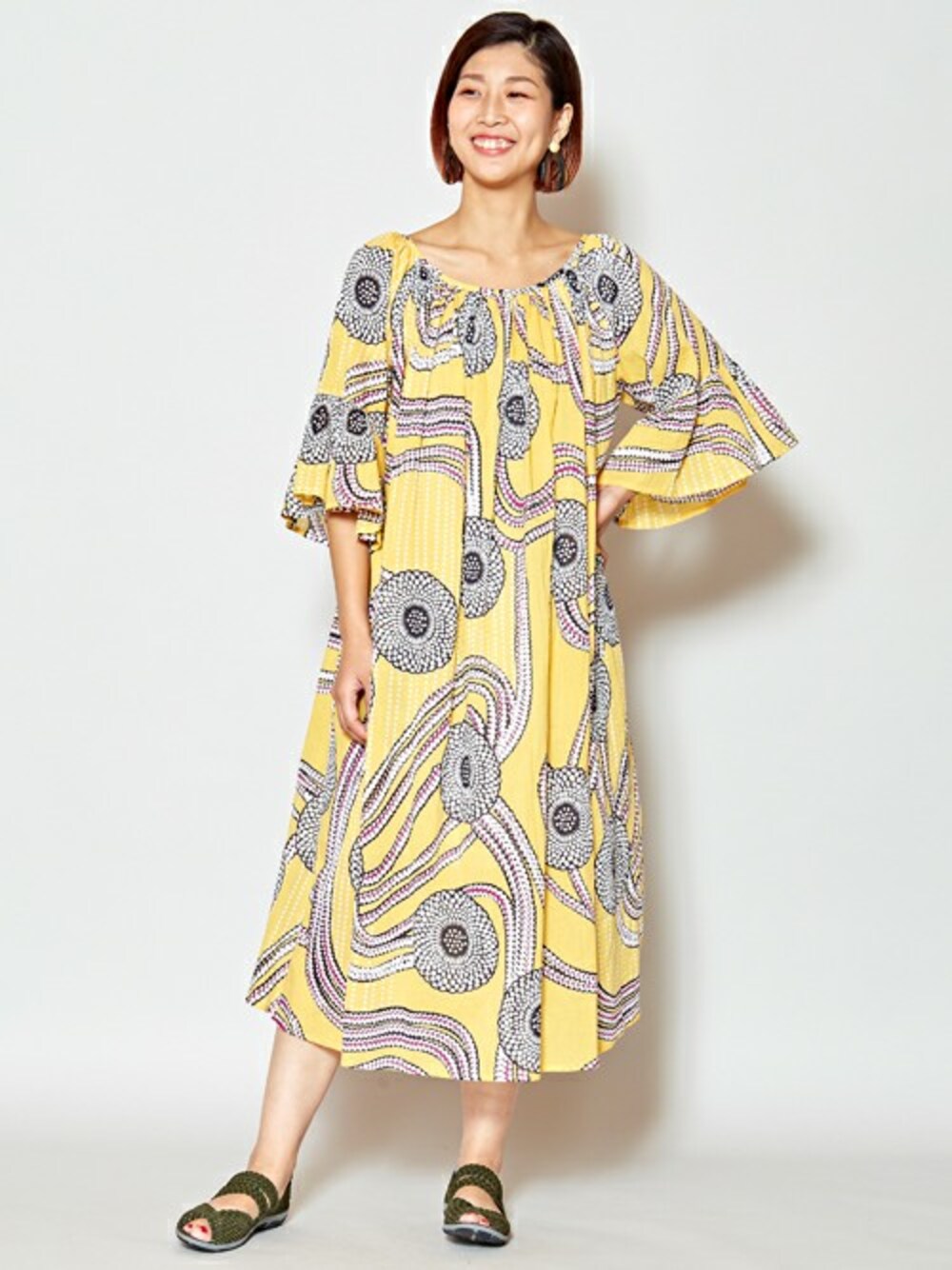 チャイハネSTAFF MOROのワンピース「【チャイハネ】yul アフリカン柄ボリュームスリーブワンピース」を使ったコーディネート