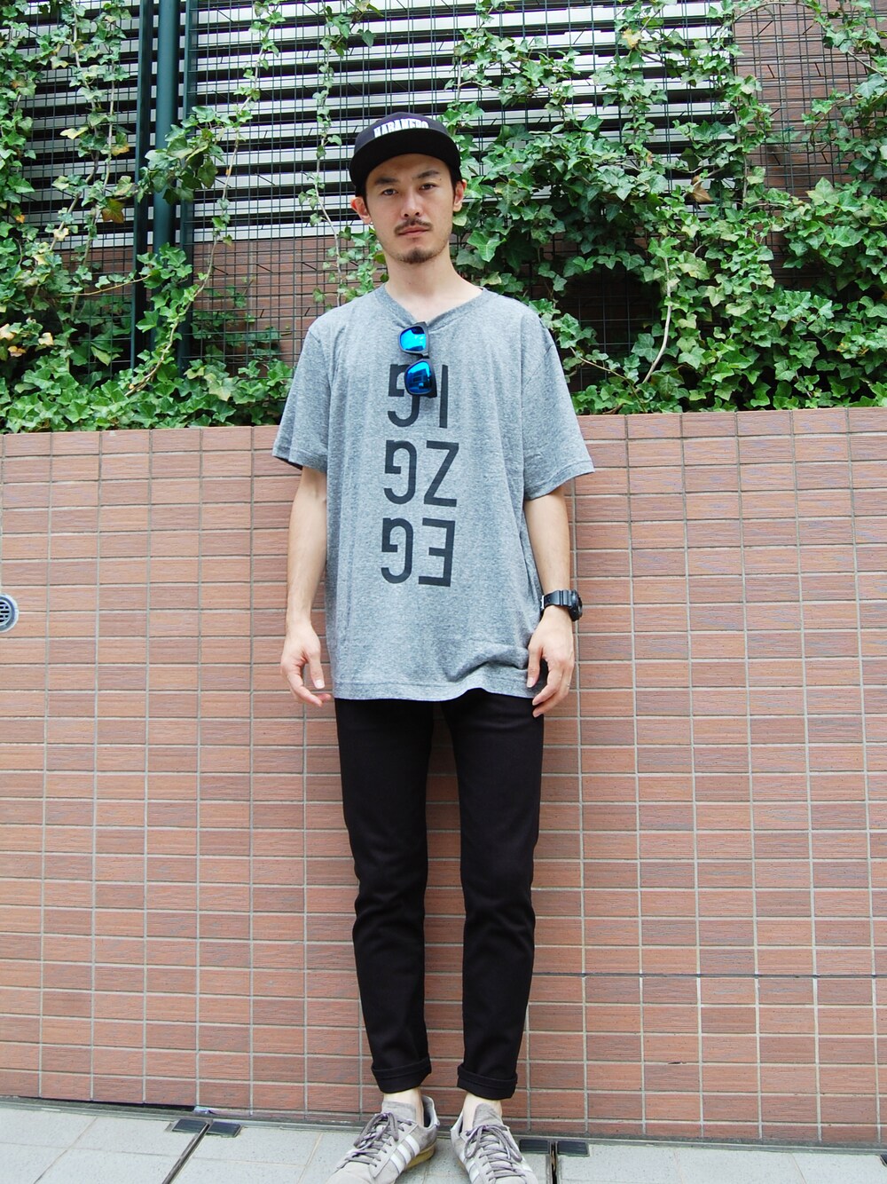 ゆったりサイズ感のカットソーTシャツと ブラックのスリムデニムパンツを合わせたコーディネート。 HOCKEY SHIRT カラー:TOP GRAY サイズ:XL SLIM JIM COLOR DENIM PANTS カラー:BLACK サイズ:30インチ SUNGLASS 02 カラー:BLUE SNAP BACK CAP / HABANERO POSSE カラー:BLACK