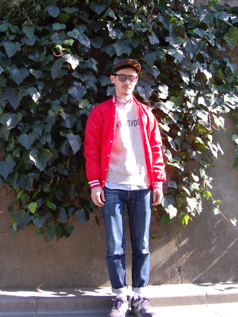 スポーツテイストなナイロンスタジアムジャンパーをシャツ、ニットでコーディネートしました。