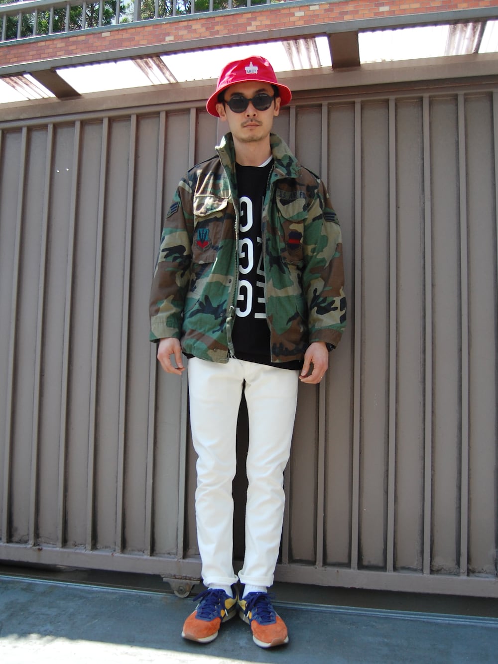 レッドのバケットハットに リメイクM-65 ホワイトのスリムジムデニム。 春の陽気に誘われて、行ってみたいよ 新歓コンパ