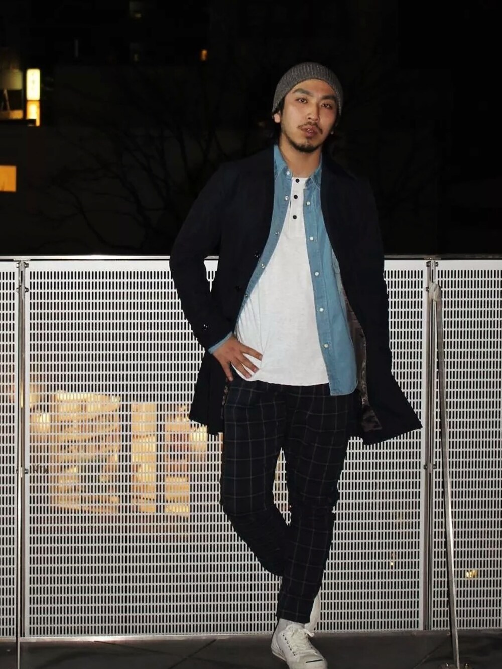 magineのステンカラーコートを中心に、 1枚では寂しいので間にデニムシャツをレイヤード。