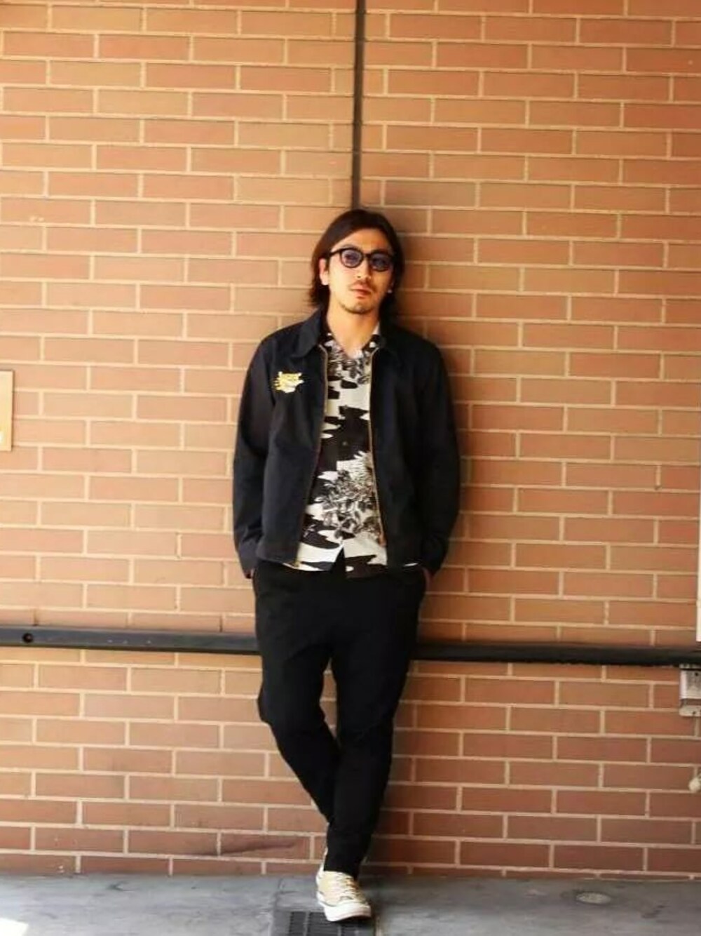 VARDEのベトジャンを中心に、インナーにはBrightThingsのアロハシャツを。全体をモノトーンコーデにまとめて。