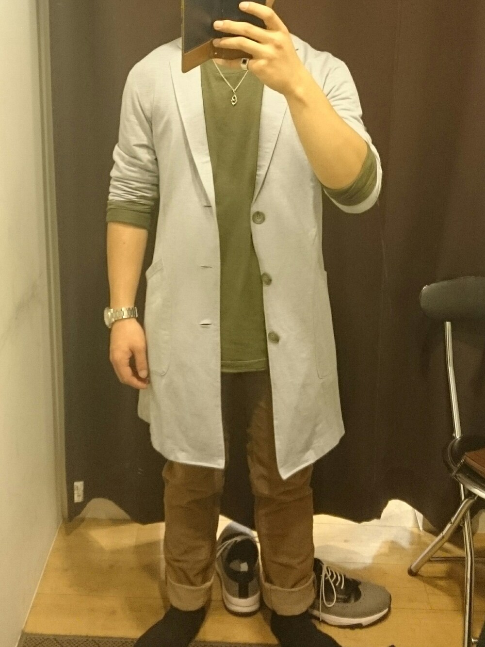 今日はおとなしめでせめてみました!! インナーを秋っぽく深めの緑にし、デニムを茶色で紅葉のイメージもたせました!言わば、秋の木って感じですね(笑) 靴とアウターでしつこくしないグレーをチョイスした感じです! アクセントとして、ネックレス、リングつけました!カバンは出してないですけど、Nixonの白で柄ものです!!