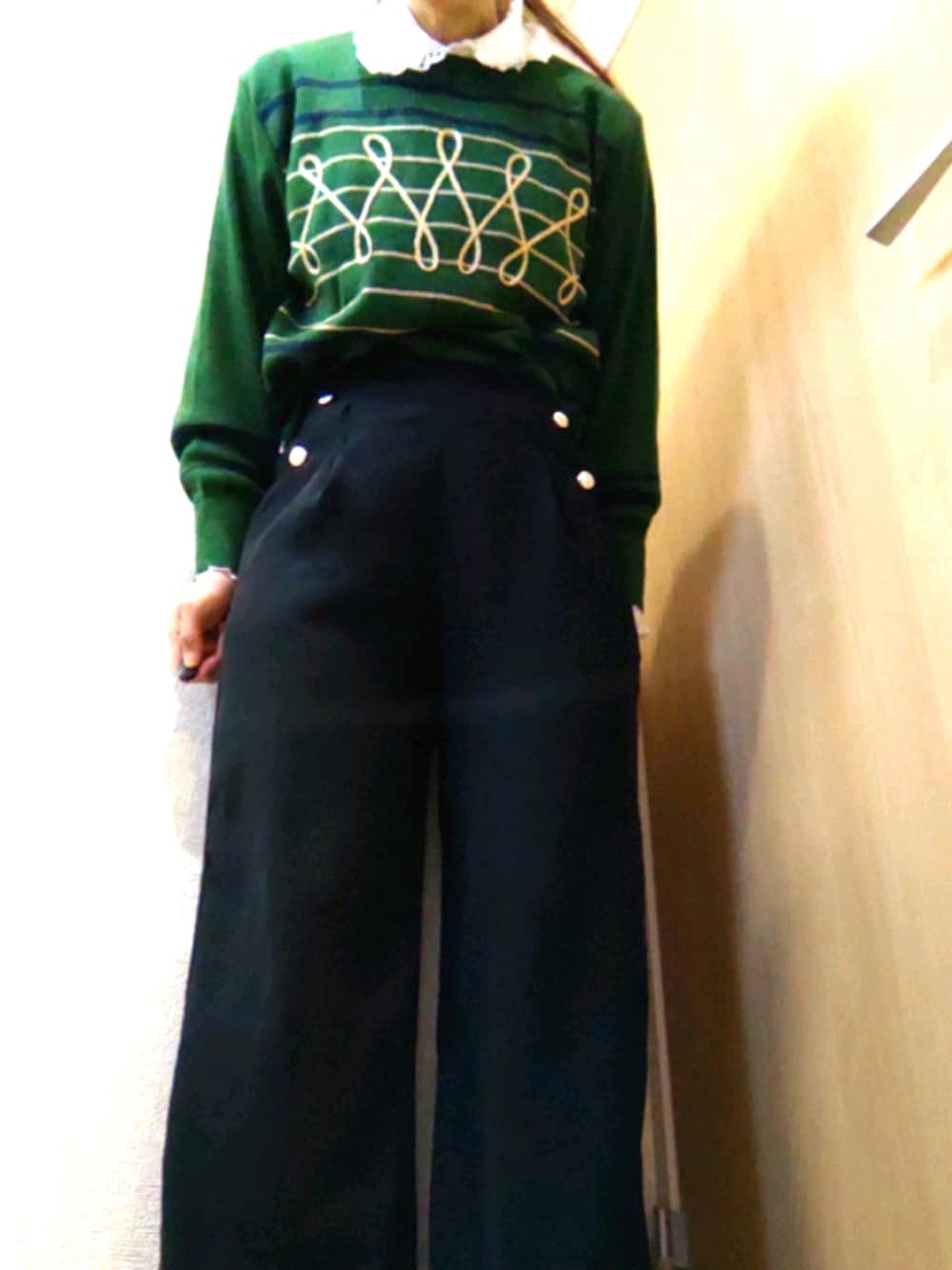 古着のヴィンテージニットにGUのワイドパンツ インナーのブラウスは子供服です
