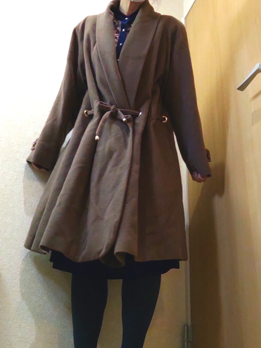 母の20~30年くらい前のコート 肩パットも入ってます 茶色にゴールドの装飾の組み合わせが、バブル時代を感じます 昔のトレンディドラマの女優さんが着ていそうです