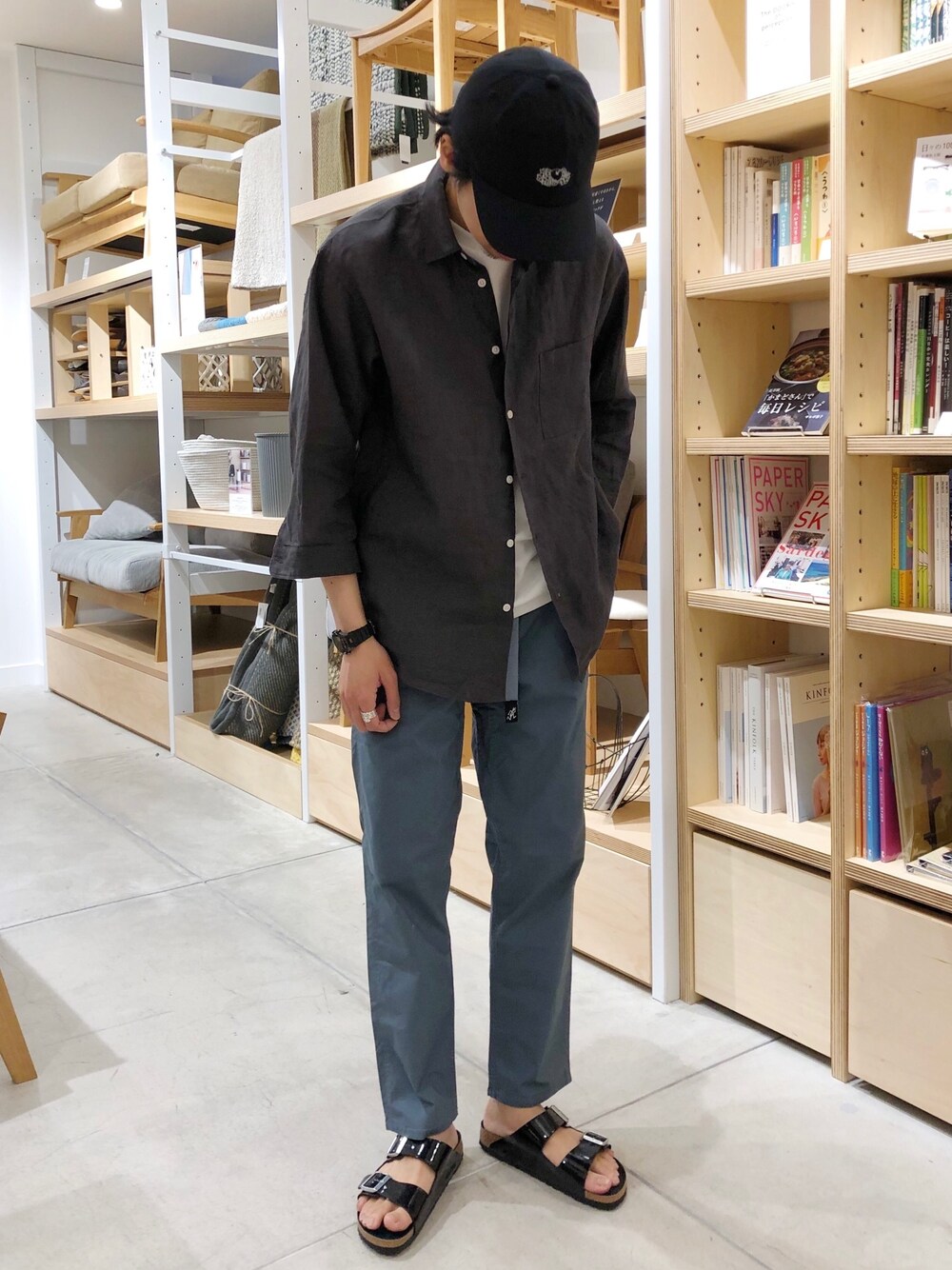 黒のリネンって凄い好きなんですよね。 黒ってクールなイメージの強いカラーなんですけど、リネンの風合いが加わると何とも言えない雰囲気が出るというか。 グラミチのパンツは今シーズンのDOORS別注の物で定番のウェザークロス。今年のはコットンの柔らかさが全面に出ていて肌触りも凄く良いです。 ビルケンシュトックのアリゾナもDOORS別注のもので、ビルケンにありそうでなかった配色、素材選びになってます。エナメルの存在感も◎ 普段スニーカーは27.0cm〜27.5cmを履きますが、サイズは41でぴったりでした。ベルトでサイズも調整しやすいです。