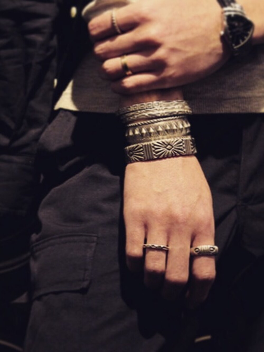 シルバー系のバングル/リストバンドを着用したメンズの春コーディネートの1枚目の写真