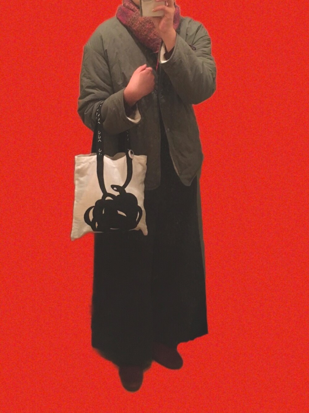 今日はおやすみ。ちょっとしたおでかけはminaの展示で買ったバッグ。ピンクのマフラーも最近使っていなかったので。