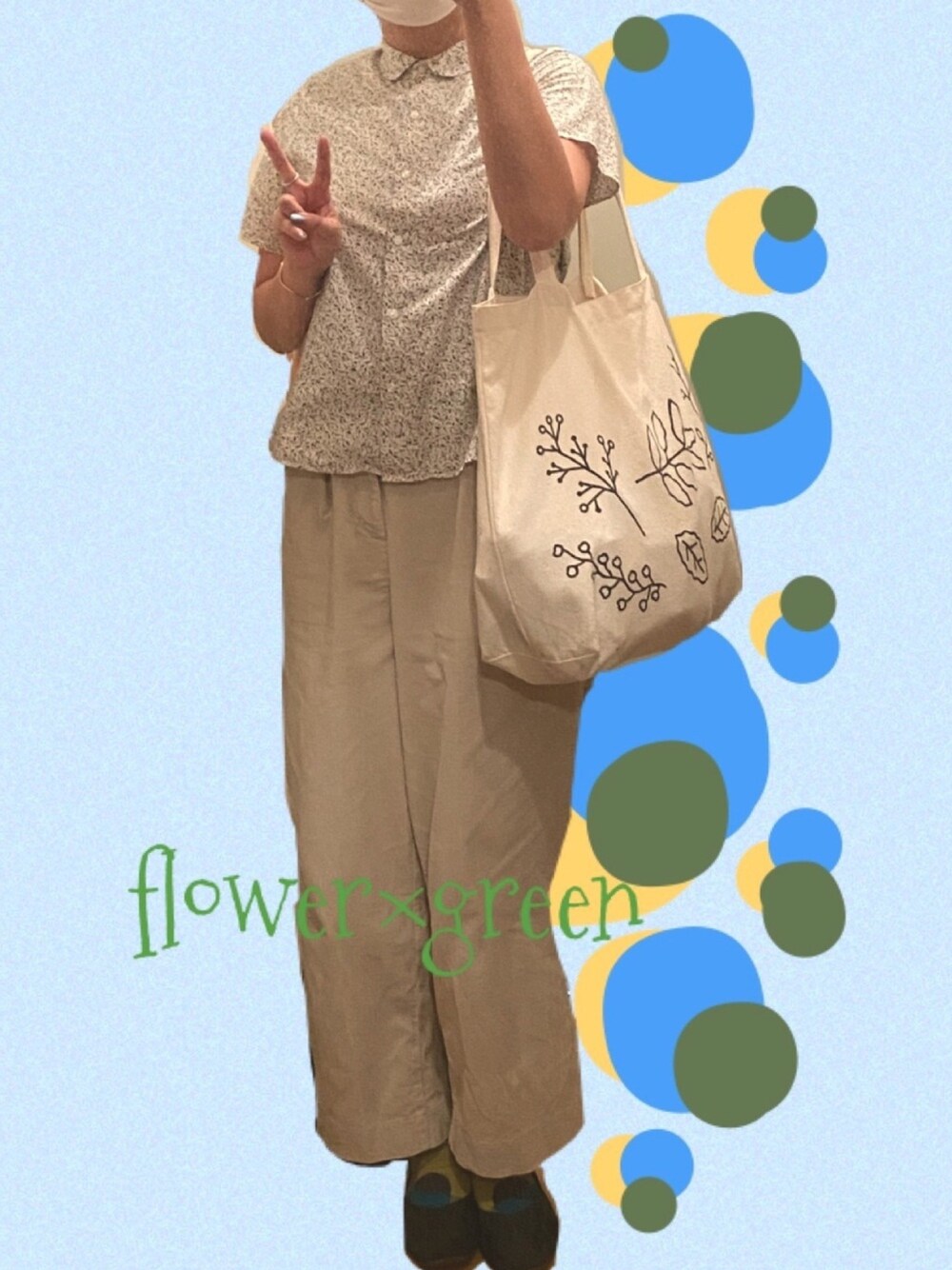 グリーンコーデで爽やかに。 シャツとバッグはお花💐