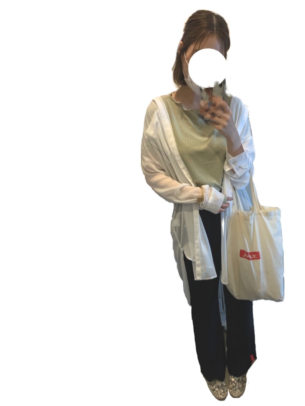 ゆったりしたシアーシャツがかわいい🌿🧡 スニーカーの後ろのタグが入り込んでしまいました(笑) シアーシャツとスラックスの相性が抜群😌
