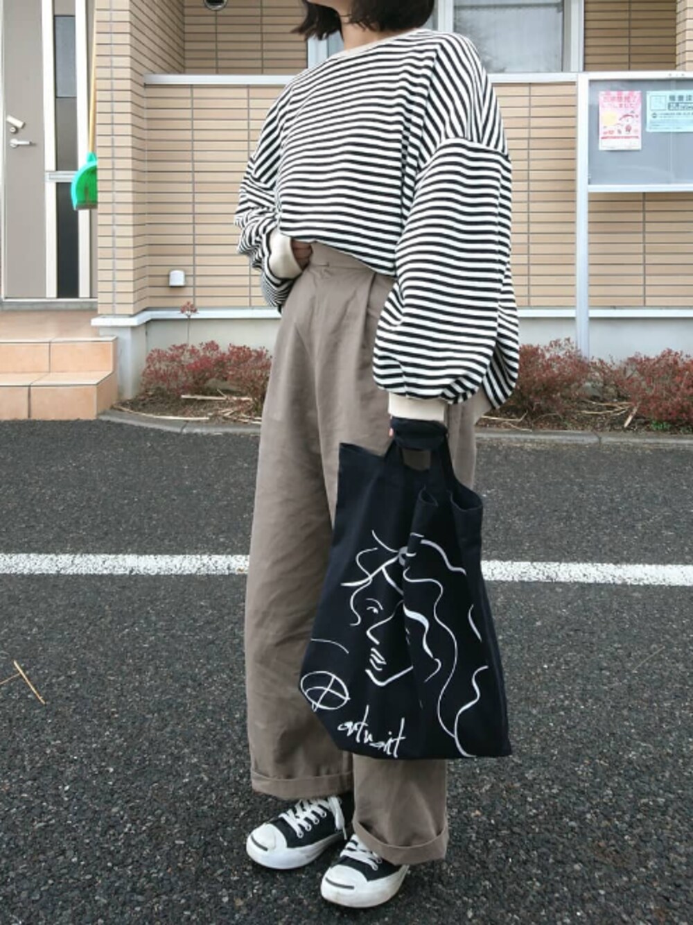 もののTシャツ/カットソー「ゆったりルーズオーバーシルエットコットンブレンドバルーンスリーブ後ろ長めボーダープルオーバー」を使ったコーディネート
