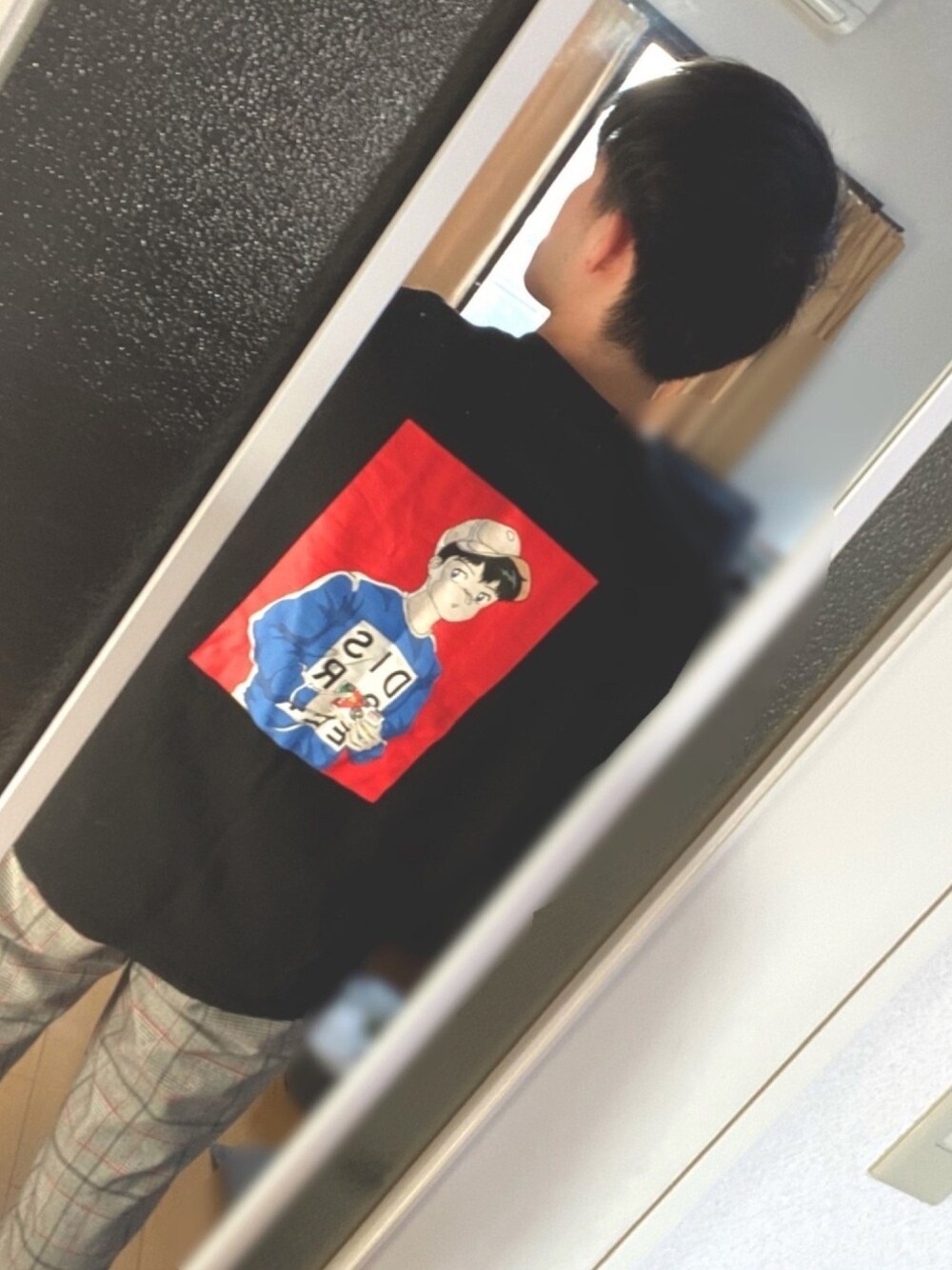 今日は後ろから撮ってみました📷 このイラストがとても可愛かったので即購入でした! チェックパンツとの相性も良い!