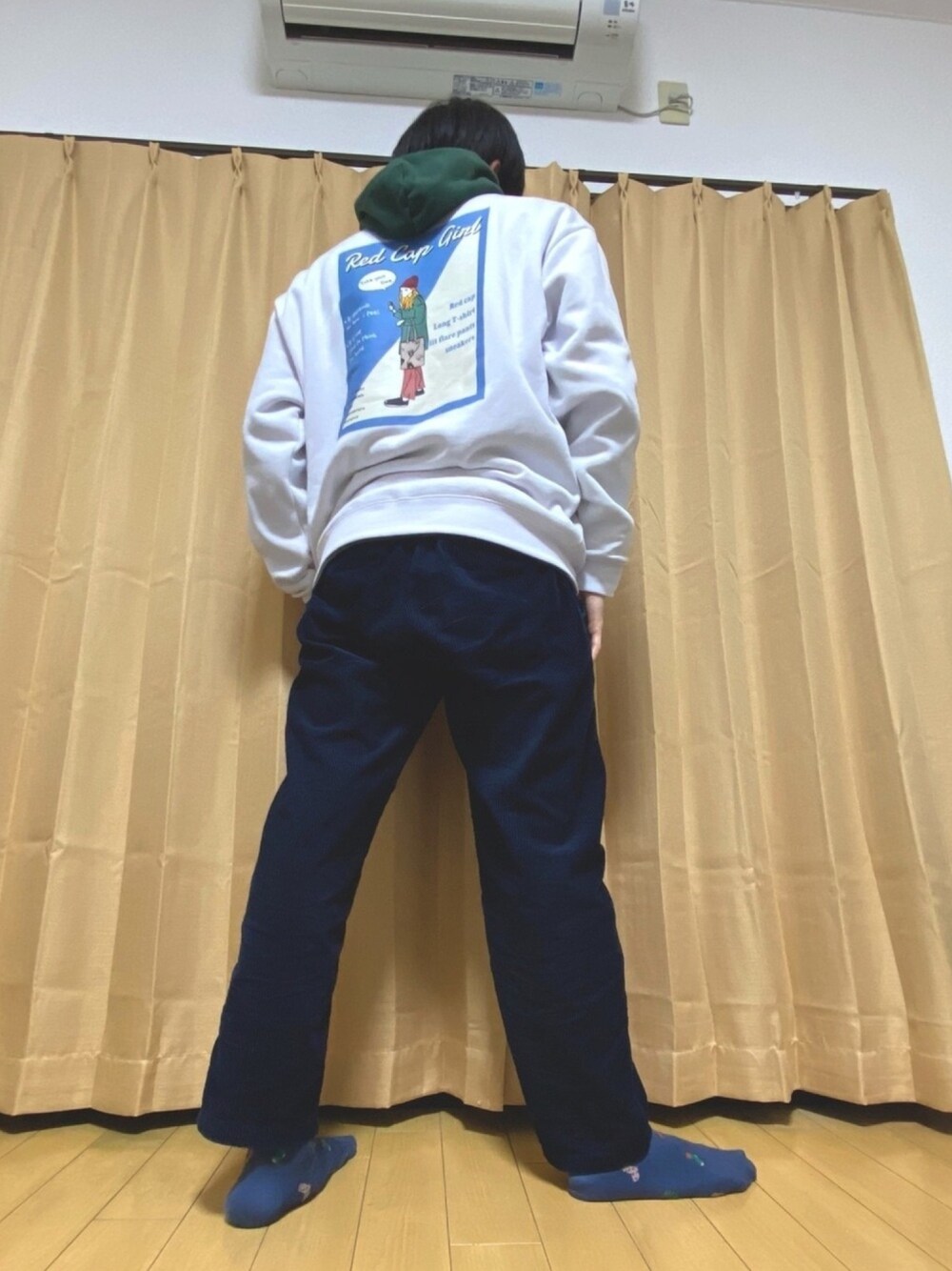 今日はいつもと違う角度から失礼します➰ パーカー×スウェットの重ね着コーデです! 緑のパーカーにイラストスウェットの重ね着は相性◎ そしてコーデュロイパンツでゆったりとしたコーデになってます🌟 今度からは新しさも込めていろんな角度から撮っていきたいと思います📸
