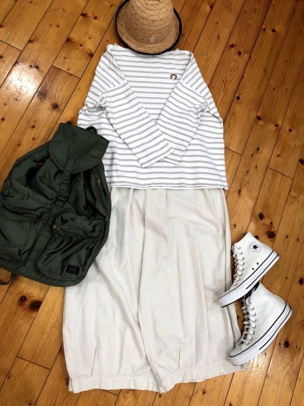 ご覧いただきありがとうございます(・ x ・) GW、もう終わってしまいますね… 今日は、近くのショッピングモールへお出掛け🚗 ³₃ 可愛いお洋服をパトロールしてこようかなっ♪♪ スニーカーとリュックでカジュアルダウンして、 定番の七分袖ボーダーにはシルエットにこだわったサーカスパンツを合わせました。