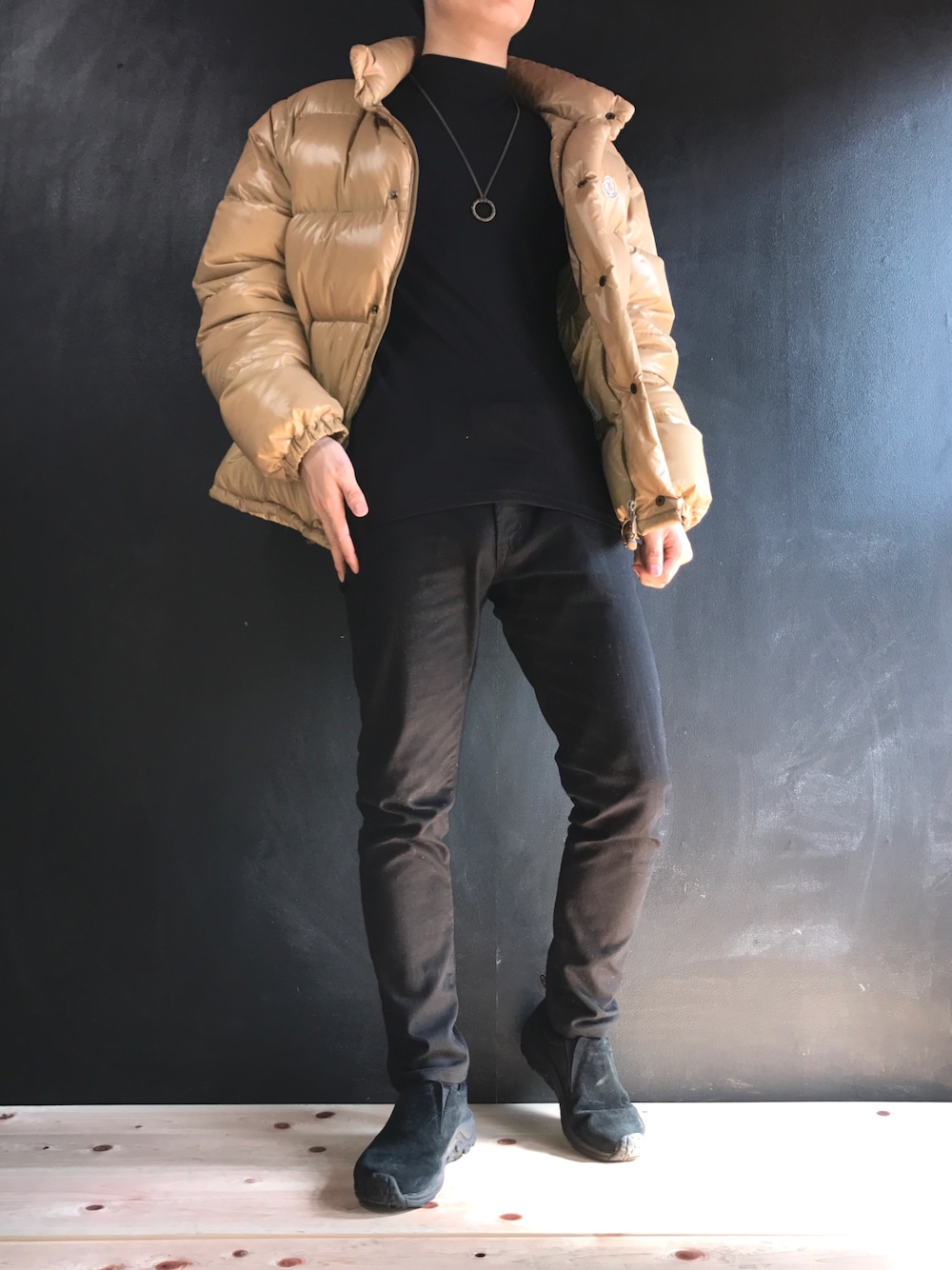 ダウンジャケットがトレンドと聞いたので着てみました🌺 全身黒で素材感も統一したかったのですが、なかなかうまくいきませんでした。 素材感が統一できればそれなりにオシャレになると思います🌺