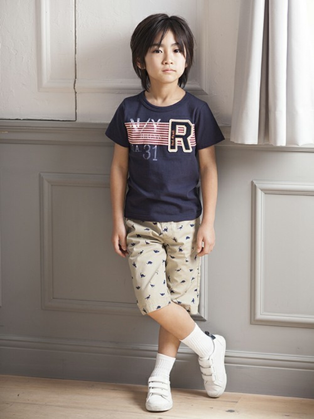 ●ボーイズ 半袖Tシャツ 全5柄 「アップリケアクセントのお洒落Tシャツ♪」 胸の大胆なボーダーと‘R’のアップリケが カッコいいお洒落な半袖Tシャツです♪ ユーズド感のあるロゴプリントも さり気ないアクセント☆ 後ろにもロゴがあしらわれ、 バックスタイルまで手を抜かないカッコよさ!! ディテールまでこだわったデザインです♪ どんなボトムスとも相性抜群で インパクトもあり1枚でCOOLにキマル◎ カラーTシャツは色やデザインによって 雰囲気が変わるので何枚あっても嬉しいよね★ 普段着にはもちろん ちょっとしたお出かけにもオススメです♪♪ ●ボーイズ 布帛ハーフパンツ 全3柄 履き心地軽やか◎布帛ハーフパンツ♪」 人気の恐竜シルエット柄がアクセントの お洒落なハーフパンツです♪ カッコいいイーグルのシルエット柄が アクセントのお洒落なハーフパンツです♪ 季節感溢れるヤシの木柄がアクセントの お洒落なハーフパンツです♪ サラッと軽やかな布帛素材で履き心地◎ 程好い抜け感のあるハーフ丈が涼しげで、 これからの季節にピッタリ!! ウエストはゴムで脱ぎ履き楽々◎ どんなトップスとも合わせやすいベージュベース で、スポーティーなカジュアルスタイルから 爽やかきれいめスタイルまで・・・ 幅広い着こなしが楽しめます♪ 軽やかでオシャレなハーフパンツで 暑い季節をCOOLに乗り切ろう~♪☆ ※ポケットは前に2つ、後ろに2つあります。 ※ユーズド感を出すため各種の洗い加工を施しております。 そのため多少の縮み、ゆがみ、色の差異が生じますので、ご了承下さい。