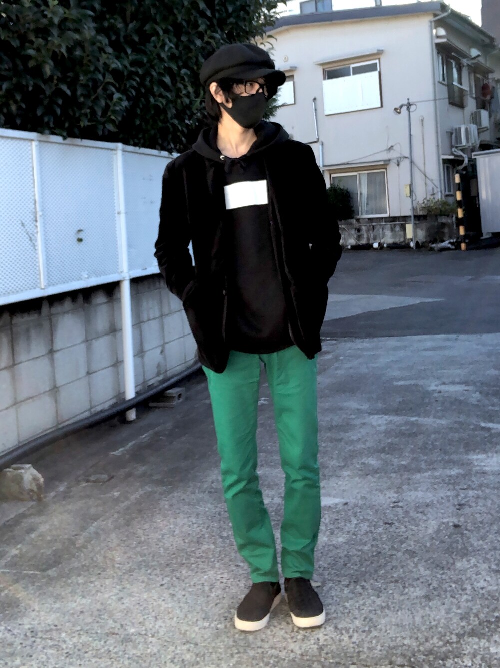 緑色のパンツを履きたくて、他をモノトーンでまとめてみました。差し色みたいな感じで原色カラーを取り入れるのは昔流行ったのですが、個人的には好きなので最近でもやってます。