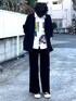 ちょっと派手でアートなシャツに黒のカーディガンを合わせました。パンツはGU×undercoverのサテンリボンコーデュロイワイドパンツ(レディースM)
