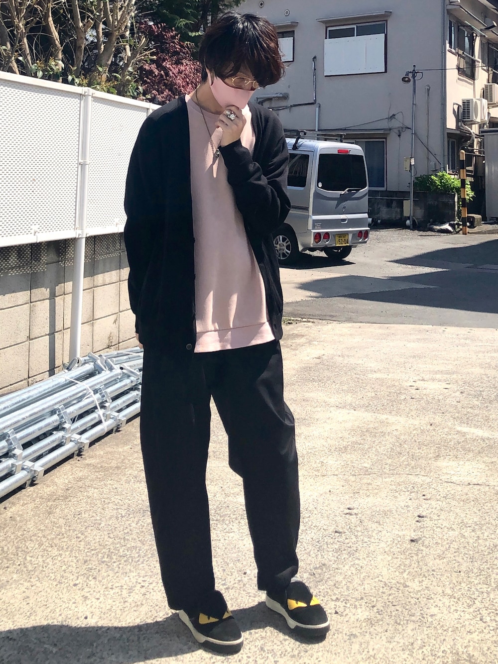 スウェットとマスクを薄ピンクで合わせて、他は黒ベースでコーデ組みました。