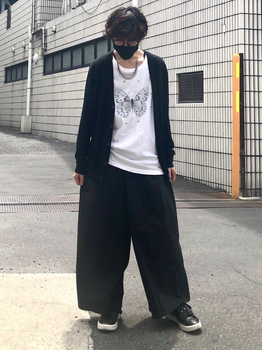 モノトーンコーデで、Tシャツの蝶がポイントです。パンツはかなりワイドでハカマみたい。