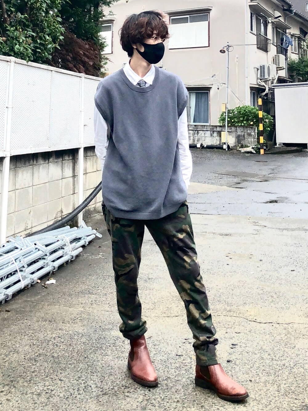 シャツとネクタイとベストで上を綺麗めにしたので下は迷彩にブーツでギャップを作ってみました。